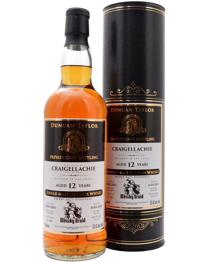 Craigellachie 2011/2023 Duncan Taylor 12-årig Private Cask Bottling är en exklusiv single malt whisky från Speyside, buteljerad vid en imponerande fatstyrka på 52,4%. Denna utgåva har lagrats i ett sherry butt-fat och är en del av en begränsad serie med endast 667 flaskor, vilket gör den till en eftertraktad whisky bland samlare och entusiaster.