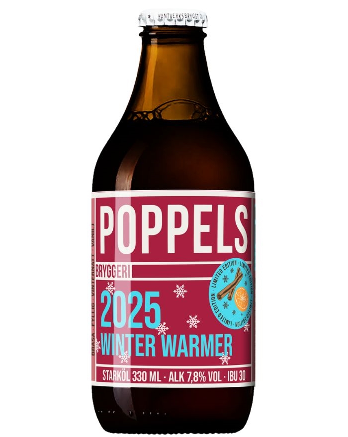 Poppels Winter Warmer 2025 är en kraftfull och kryddig svensk julöl på 7,8 %, bryggd med apelsin och kanel – perfekt för vinterns måltider och lugna stunder.